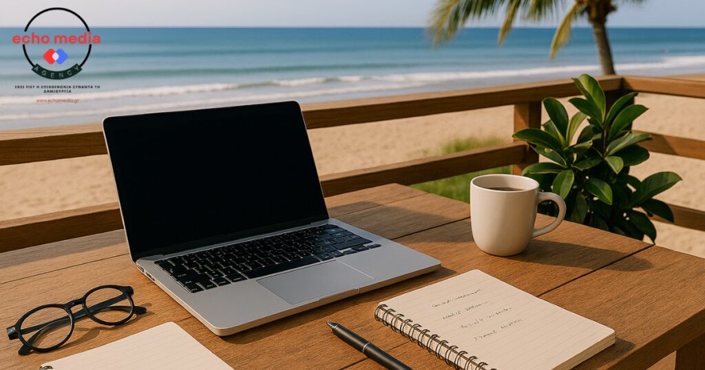 Στην Echomedia πιστεύουμε ότι η επικοινωνία και η δημιουργία δεν κάνουν διακοπές. Σου δείχνουμε πως να μένεις παρών, ακόμα κι όταν ο υπόλοιπος κόσμος “απουσιάζει”.